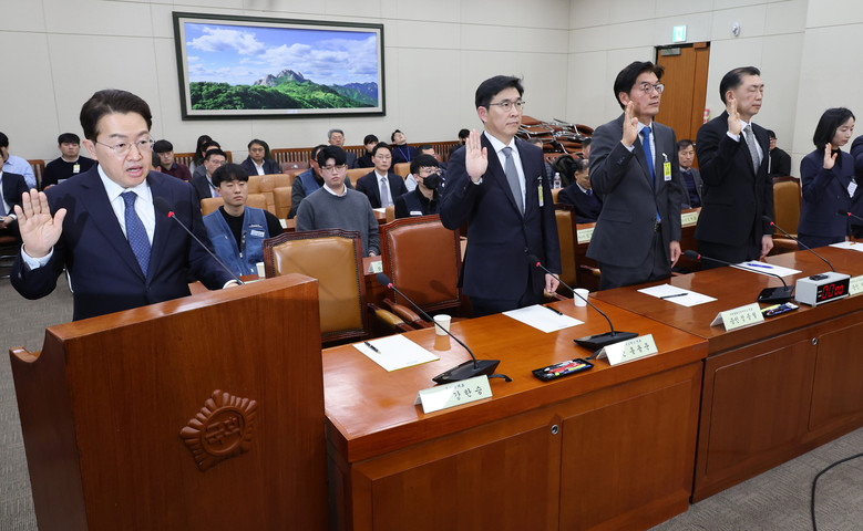 21일 국회 환경노동위원회에서 열린 쿠팡 택배노동자 심야노동 등 근로조건 개선 및 대유위니아그룹 임금체불 관련 청문회에서 강한승 쿠팡 대표 등 참석한 증인들이 선서하고 있다. 2025.1.21