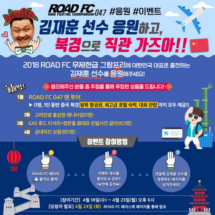 [ 세계타임즈 김인수 기자 ] ROAD FC (로드FC)가 5월 12일 중국 북경 캐딜락 아레나에서 열리는 ROAD FC 047 대회를 기념해 다양한 상품을 걸고 이벤트를 진행하고 있다.