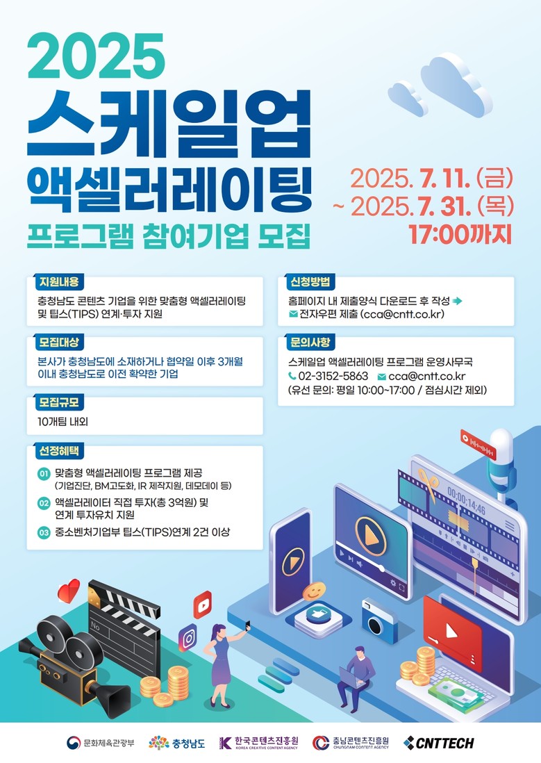 -우수기업 대상 씨엔티테크 직접 투자(총 3억 원) 팁스 연계 혜택 제공- [세계타임즈=충남 이현진 기자] 충남콘텐츠진흥원(원장 김곡미, 이하 진흥원)은 도내 콘텐츠 기업의 성장 기반 마련을 위한 「2025 스케일업 액셀러레이팅 프로그램」 참가 기업을 오는 31일(목)까지 모집한다고 밝혔다.