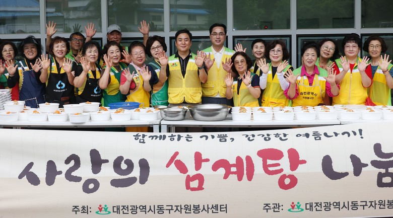 [동구 세계타임즈=이채봉 기자] 대전 동구(구청장 박희조)는 16일 동구 자원봉사협의회(회장 우선제) 주관으로 대청동 다목적회관에서 여름맞이 ‘사랑의 삼계탕’ 나눔 봉사를 실시했다고 밝혔다.