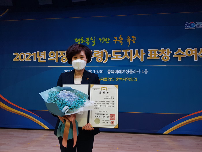 [충북=세계타임즈 이현진 기자] 충북도의회 정책복지위원회 이숙애(청주1) 의원이 28일 충북미래여성플라자에서 열린 민주평화통일자문회의 충북지역회의(부의장 이재한) 유공자문위원 표창 수여식에서 의장 표창을 받았다.