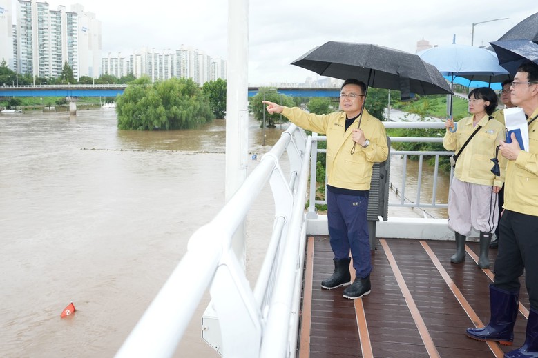 ▲ 지난해 8월 중랑천 홍수주의보 발표에 따라 긴급 현장 점검을 하는 류경기 중랑구청장