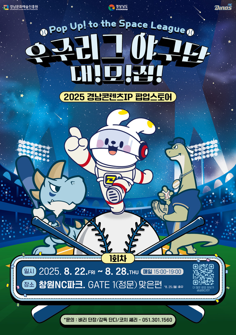 - 한정판 굿즈 판매와 체험 콘텐츠로 도민과 야구팬을 사로잡는다! [세계타임즈=경남 최성룡 기자] 경상남도(도지사 박완수)와 경남문화예술진흥원은 오는 8월 22일부터 28일까지 창원 NC파크 야외광장에서 ‘Pop Up to the Space League! 우주리그 야구단 대모집’이라는 주제로 ‘경남 콘텐츠IP 팝업스토어’를 개최한다고 밝혔다.