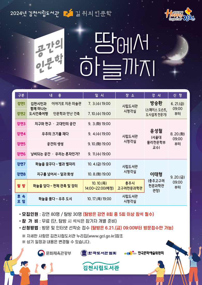 [김천시 세계타임즈=한윤석 기자] 김천시립도서관(관장 이순영)에서는 지난 3일 문화체육관광부와 한국문화예술위원회가 공동주최한 공모사업 <2024년 길 위의 인문학 : 땅에서 하늘까지>를 80여 명의 시민들이 모인 가운데 성황리에 개강했다.