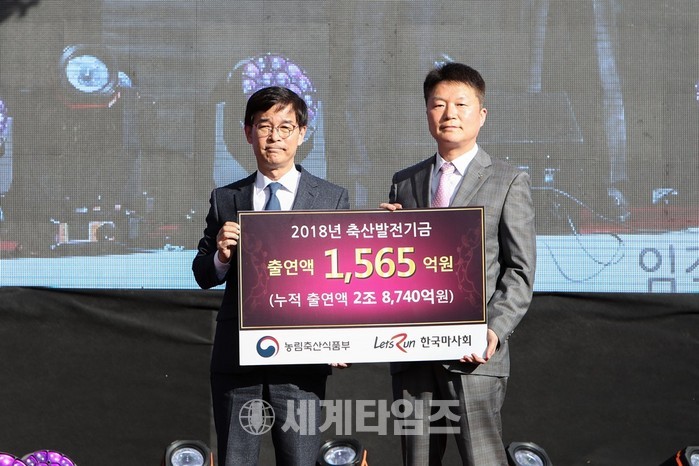 [세계타임즈 김인수 기자]한국마사회(회장 김낙순)는 12일(목) 과천 렛츠런파크 서울에서 축산발전기금 전달식을 가졌다. 전달금액은 1,565억원으로 김낙순 한국마사회장과 유기엽 축산발전기금 사무국장, 임직원 등 200여명이 참석한 가운데 진행됐다.