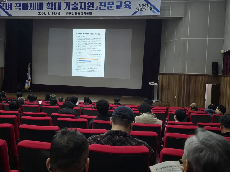 교육은 직파재배 사업 대상자 및 농업인 200여 명이 참석한 가운데 △직파재배 시 유의사항 △유형별 실증사례 발표 △충남 육성 신품종 소개 △충남쌀 품질 향상 방안 △마른논 써레질 재배기술 및 직파 연계 실증 사례 등 지난해 성과와 올해 추진 방향을 공유하는 자리로 마련했다.