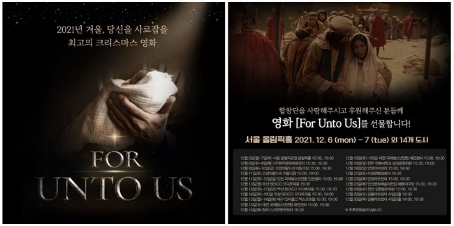 ‘For Unto Us’ 영화는 2000년 전 유대 땅 베들레헴의 옛 시대를 재현, 예수 탄생, 고난 등 크리스마스의 진정한 의미를 풀어내었고, 총 90분 분량의 작품이다. 특히, 코로나19로 전국의 시민들에게 얼어붙은 마음에 따뜻한 위로를 안겨줄 친숙한 크리스마스 캐롤과 클래식 명곡들도 수록됐다.
