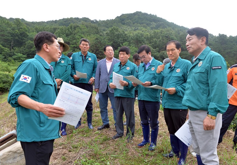 충남도의회 홍성현 의장과 이철수 운영위원장, 박기영 행정문화위원장, 김민수 복지환경위원장, 고광철 건설소방위원장, 방한일 의원, 조길연 의원, 김기서 의원과 사무처 직원들은 11일 도내 폭우 피해가 발생한 지역 가운데 한 곳인 부여군을 찾아 피해 상황을 점검했다.