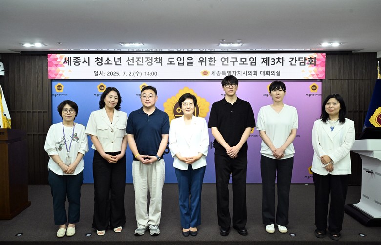 [세종 세계타임즈=이채봉 기자] 세종특별자치시의회(의장 임채성) ‘세종특별자치시 청소년 선진정책 도입을 위한 연구모임’(대표의원 이순열)은 2일, 시의회 1층 대회의실에서 제3차 연구모임을 개최하고, 변화하는 청소년 세대의 특성과 이에 대한 정책적 대응 방안을 모색했다.