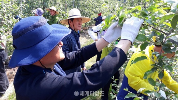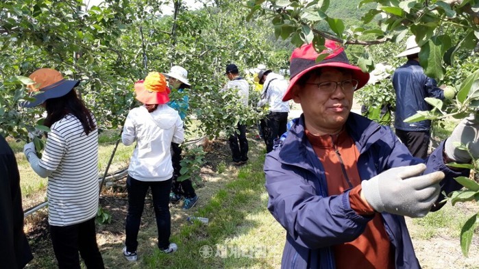 청주시 농업정책국 직원 40여명은 18일 본격 영농철을 맞아 일손이 부족한 미원면 계산리 사과과수원을 찾아 사과 과실 솎기 작업을 지원했다.