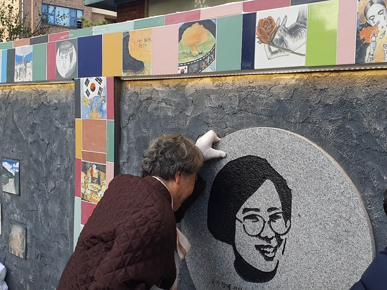 | ▲ ‘기억이음 벽’에 새겨진 딸을 보고 흐느끼는 박선영 열사의 어머니 |