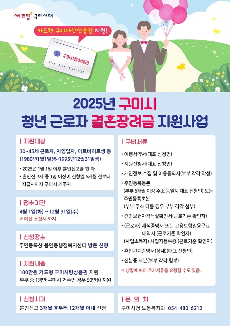 - 30세 이상 45세 이하 청년근로자, 혼인 시 구미사랑상품권 100만원 지급 [구미시 세계타임즈=한윤석 기자] 구미시가 저출생과 인구 감소에 대응하고자 4월 1일부터 ‘청년근로자 결혼장려금 지원사업’을 시행한다. 이번 사업은 결혼을 준비하는 청년들의 경제적 부담을 완화하고, 결혼과 출산으로 이어지는 인구 선순환 구조를 유도하기 위해 마련됐다.