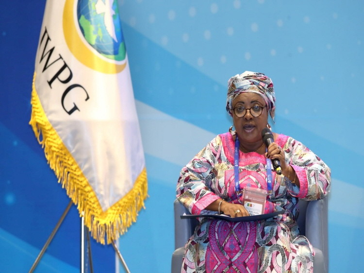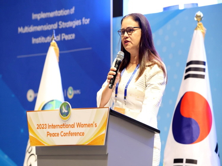 ▲19일 인천 중구 그랜드 하얏트 인천 웨스트 타워에서 ‘2023 세계여성평화 콘퍼런스’가 열린 가운데 마리아 데 파티마 아폰소 빌라 노바 상투메프린시페 영부인이 축사를 하고 있다. (제공=IWPG)
