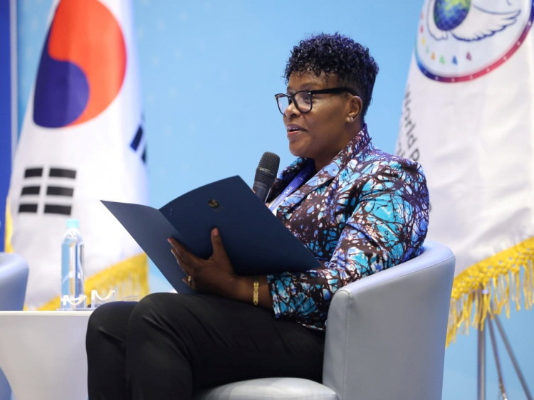 ▲에이야 벤자민 와릴레 남수단 여성아동복지부 장관이 19일 인천 중구 그랜드 하얏트 인천 웨스트 타워에서 열린 ‘2023 세계여성평화 콘퍼런스’에서 ‘지속가능한 평화의 필요성과 시급성’에 대해 특별 연설을 하고 있다. (제공=IWPG)