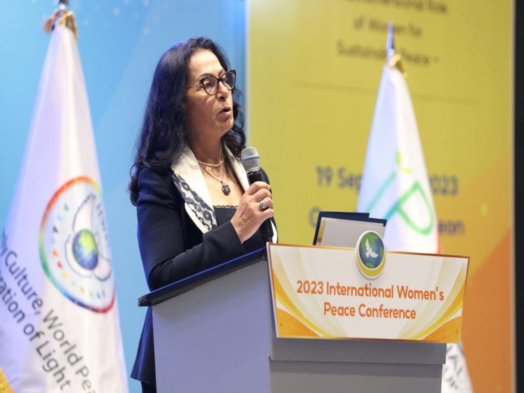 ▲네지하 라비디 전(前) 튀니지 여성가족아동노인부 장관이 19일 인천 중구 그랜드 하얏트 인천 웨스트 타워에서 열린 ‘2023 세계여성평화 콘퍼런스’에서 ‘미래를 위한 여성 평화교육에서 변화하는 세계에서의 역량 강화’를 주제로 발표하고 있다. (제공= IWPG)