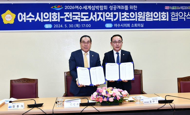 [여수시 세계타임즈=우덕현 기자] 여수시의회(의장 김영규)는 5월 30일 소회의실에서 전국도서지역기초의원협의회(협의회장 조인호)와 2026여수세계섬박람회 성공개최를 위한 협약식을 열었다.