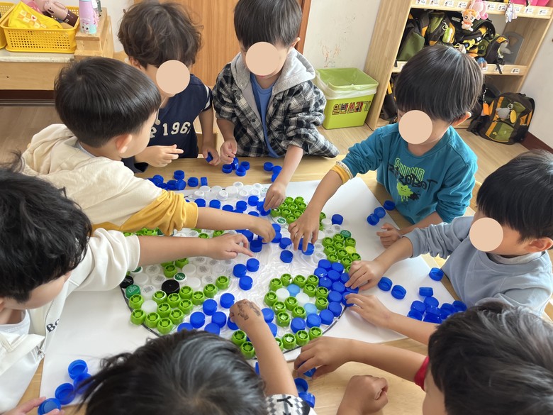 이어 28일(화)부터 30일(목)까지는 학급별로 ‘지구를 생각하는 새활용놀이’가 진행되었다. 3세 풀빛반은 ‘폐그림책을 활용한 나만의 이야기 만들기’, 4세 솔빛반은 ‘페트병 숲 꾸미기’, 5세 하늘빛반은 ‘우유팩 마을 만들기’ 등 업사이클링 놀이를 통해 지속가능한 생산·소비의 가치를 탐색하였다.