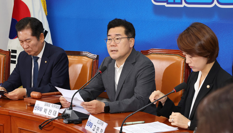 더불어민주당 박찬대 당대표 직무대행 겸 원내대표(가운데)가 9일 오전 국회에서 열린 최고위원회의에서 발언하고 있다. 2024.8.9