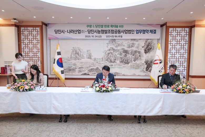 - 쿠팡에 년간 1만 톤 이상 당진쌀 판매 최우선 목표 - [세계타임즈=당진시l 이현진 기자] 당진시(시장 오성환)는 지난 24일 당진시청 해나루홀에서 나라산업 주식회사(대표이사 한송이), 당진시농협쌀조합공동사업법인(대표이사 박광서)과 함께 ‘당진쌀 판로 확대를 위한 상생발전 업무협약’을 체결했다고 27일 밝혔다.