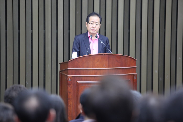 홍준표 대표가 의원총회에서 인사말을 하고있다 사진=이연종기자