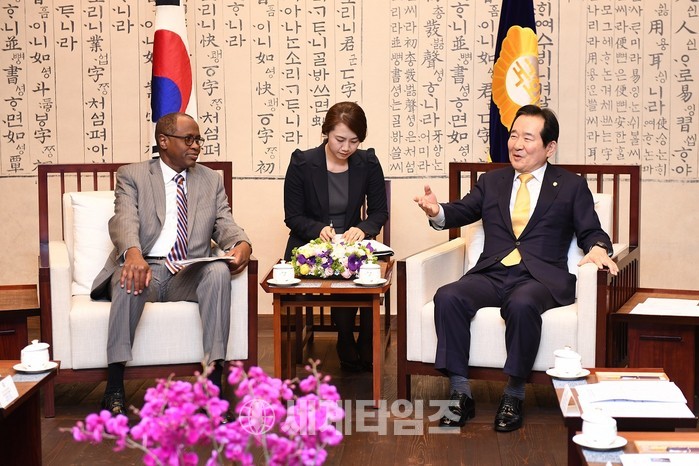 [세계타임즈 이채봉 기자]정세균 국회의장은 4월 10일(월) 오후 3시 국회 의장 집무실에서 오마르 아브디(Omar ABDI) UNICEF 부총재의 예방을 받았다.