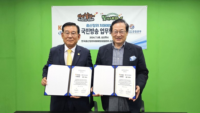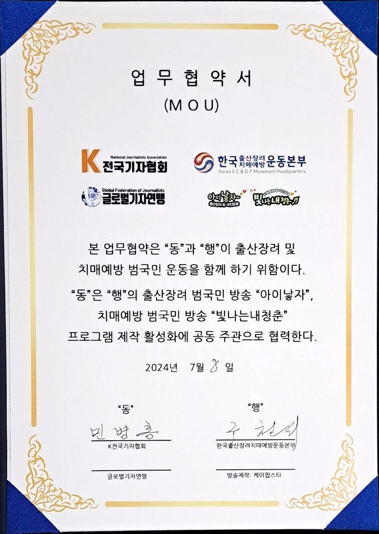 지난 8일 월요일 한국출산장려치매예방운동본부(중앙회장 구천서)와 전국기자협회(회장 민병홍·사무총장 국용호)가 저출산·고령화 사회 예방을 위한 출산 장려 범국민방송 '아이낳자'와 치매 예방 범국민 방송 '빛나는내청춘'의 제작 활성화를 위한 공동 주관 업무 협약을 체결했다.