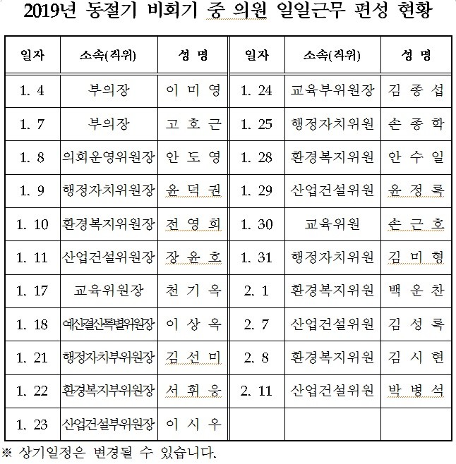 시의회(의장 황세영)는 1월 4일부터 2월 11일까지(토요일 및 공휴일 제외) 이미영 부의장을 시작으로, 21명의 의원이 순번제로 의원 일일근무를 실시하여 민의수렴과 민원상담 등 대민 의정활동을 펼친다고 밝혔다.