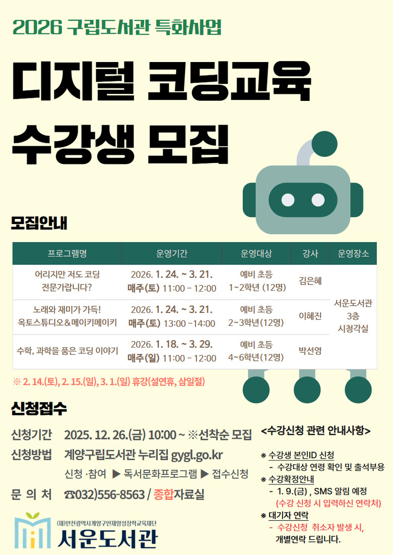 - 디지털 창의력 향상 기대 - [계양구 세계타임즈=심하린 기자] 인천 계양구 서운도서관(관장 권문혁)은 초등학생을 대상으로 오는 2026년 1월부터 3월까지 ‘디지털 코딩 교육’을 운영한다고 밝혔다.
