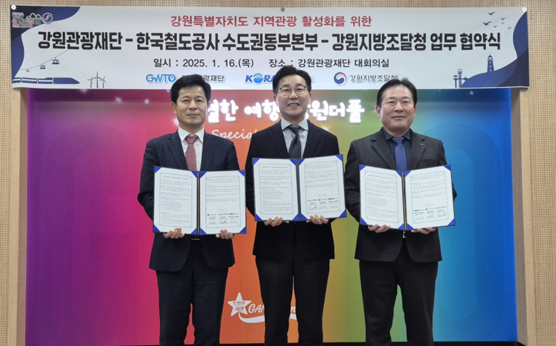[강원도 세계타임즈=김민석 기자] 강원관광재단(대표이사 최성현)은 1월 16일, 코레일 수도권동부본부(본부장 김경재), 강원지방조달청(청장 이병철)과 함께 강원관광재단 대회의실에서 강원 지역관광 활성화를 위한 업무협약(MOU)을 체결했다고 밝혔다.