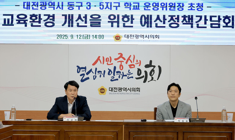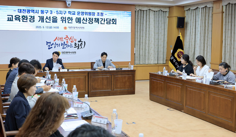 [대전 세계타임즈=이채봉 기자] 대전시의회 교육위원회는 12일 시의회 3층 소통실에서 동구 3·5지구 학교 운영위원장 초청 교육환경 개선을 위한 예산정책간담회를 개최했다. 이번 간담회는 이상래 의원(국민의힘, 동구2)이 주재해 지역 교육현장의 주요 요구를 청취하고, 2026년도 예산 편성 과정에 반영하기 위해 마련됐다.