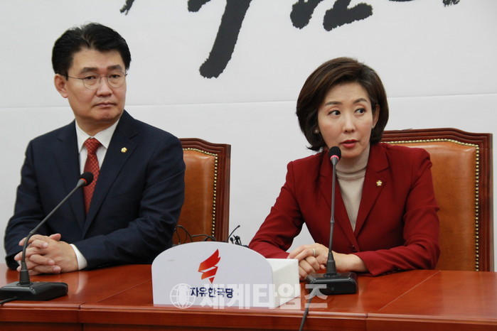 자유한국당 신임 원내대표 나경원의원 당선후 기자간담회 하고 있다.사진=김인수 기자