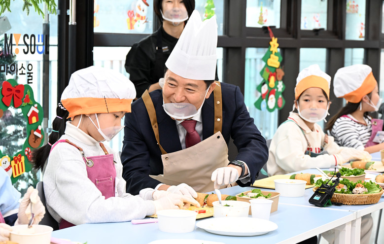 오 시장은 참석자들과 블록 누르기 세리머니에 참여한 뒤, 각 층을 둘러보며 아이들이 이용하게 될 시설을 점검했다. 이어 2층 키움센터에서 아이들과 함께 두부를 활용한 ‘저염쌈장 상추쌈밥’과 저염 간장으로 조리한 ‘볶은유부 꼬마김밥’을 만들며 자극적인 음식의 위험성, 성장기 올바른 식습관의 중요성에 대해 이야기 나눴다.