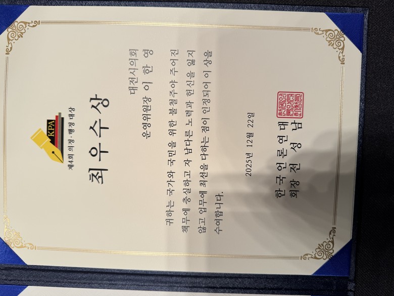 이 위원장은 수상 소감을 통해 “이번 수상은 개인의 영광을 넘어, 시민을 위해 함께 고민하고 노력해 온 대전시의회 전체의 성과라는 점에서 더욱 뜻깊다”며“시민의 신뢰에 성과로 답하는 의정활동을 흔들림 없이 이어가겠다”는 의지를 밝혔다
