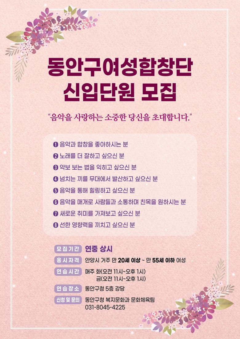 한편, 동안구여성합창단은 오는 16일까지 신규 단원을 모집한다. 음악을 사랑하고 지역사회 문화예술 발전을 위해 봉사 정신을 갖춘 안양시 거주 여성(만 20세~55세)이라면 누구나 동안구청 복지문화과(☎031-8045-4225)로 방문 접수하면 된다.