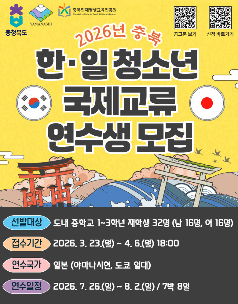 이번 연수는 1992년부터 충청북도와 자매결연한 야마나시현과의 협력을 바탕으로 진행되며, 현지 중학생들과의 직접적인 교류를 통해 양 도시의 미래 세대가 우정을 쌓는 뜻깊은 시간이 될 예정이다.
