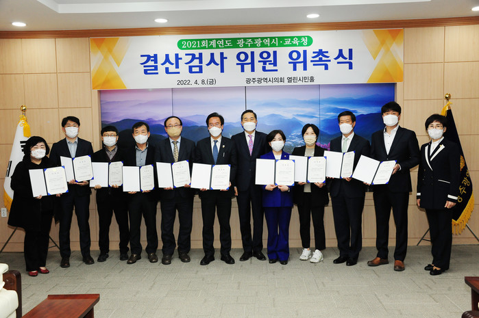 [광주=세계타임즈 손권일 기자] 광주광역시의회(의장 김용집)는 4월 8일 시의회 열린시민홀에서 광주시와 광주시교육청에 대한 2021회계연도 결산검사위원 위촉식을 개최했다. 2021회계연도 결산검사는 4월 8일부터 27일까지 20일간 진행될 예정이다.