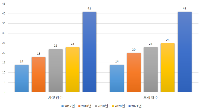 연도별로 교통사고와 부상자수는 2017년 14건에서 지속적으로 증가하여 2021년에는 41건으로 2배이상 각각 증가했고, 2021년은 교통사고 78.3%와 부상자수 64%로 전년대비 증가폭이 매우 높았다.