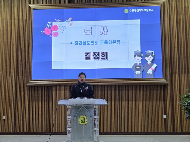 [전남 세계타임즈=우덕현 기자] 김정희 전남도의회 교육위원장은 1월 6일 순천매산여자고등학교에서 열린 제75회 졸업식에 참석해 졸업생들의 새로운 출발을 축하하고, 전남교육의 미래를 향한 도의회 교육위원회의 지원 의지를 밝혔다.