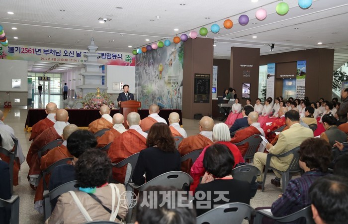 [대전=세계타임즈 이장성 기자] 대전광역시(시장 권선택)는 불기 2561년 부처님 오신 날을 축하하고, 시정과 시민의 안녕을 기원하기 위하여 권선택 대전시장, 김경훈 대전시 의회 의장, 초청인사, 불자회원들이 참석한 가운데 25일 대전시청 1층 로비에서 등탑 점등식을 가졌다.