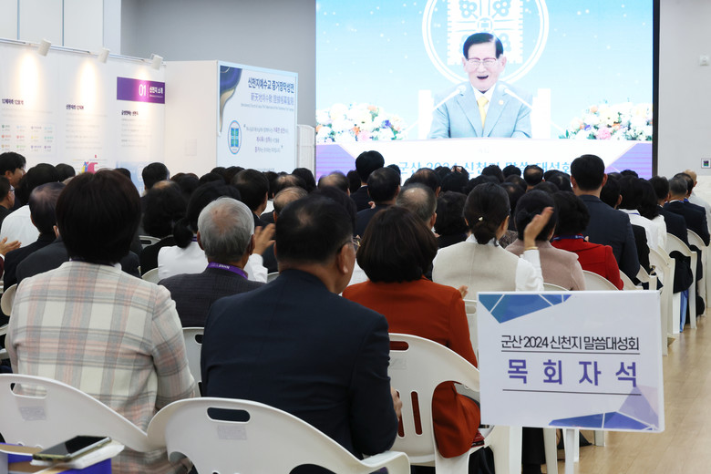 15일 신천지 군산교회에서 열린 군산 2024 신천지 말씀 대성회에 참석한 목회자들이 신천지예수교회 이만희 총회장의 강연을 경청하고 있다.