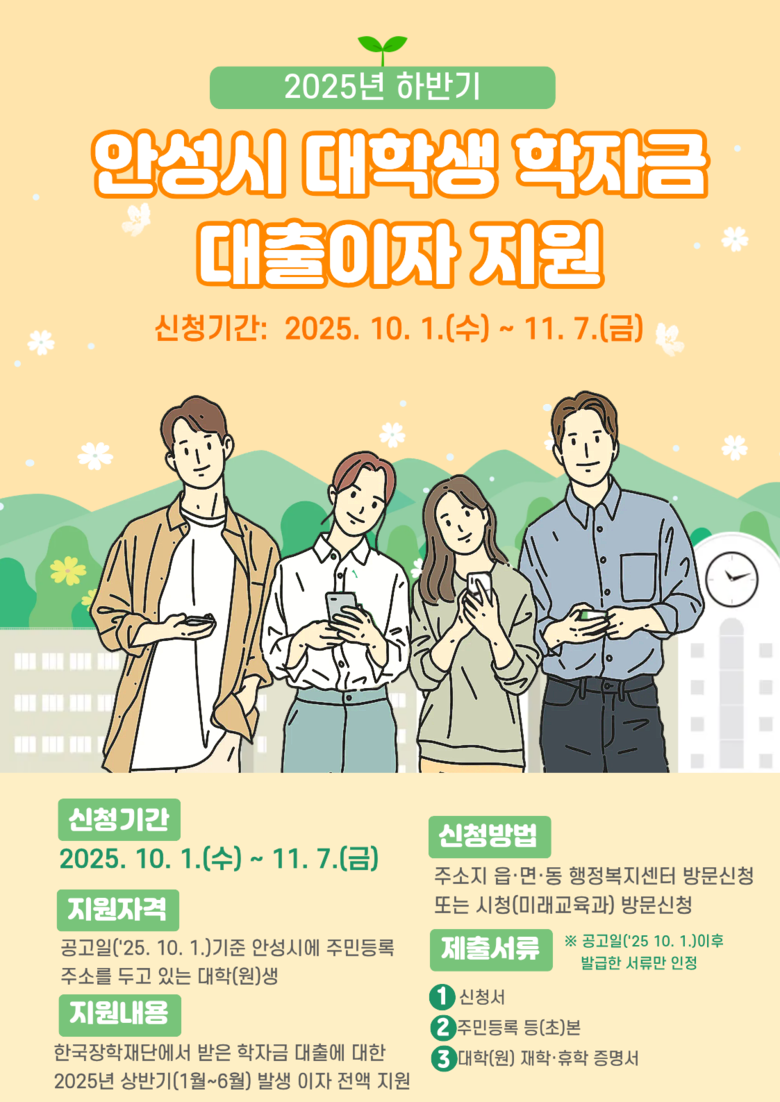 지원 대상은 공고일(2025. 10. 1.)기준으로 안성시에 주민등록 주소를 두고 재학(휴학 포함)중인 대학(원) 재학생(휴학생)이다.