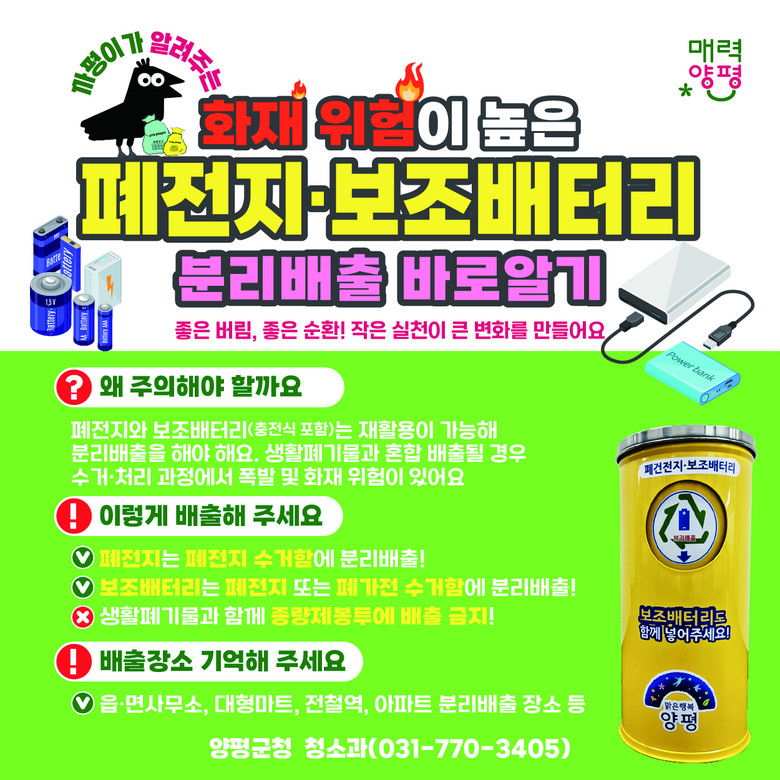 전진선 양평군수는 “보조배터리나 충전용 전지는 크기가 작아 무심코 일반쓰레기로 버리기 쉽지만, 작은 부주의가 큰 화재 사고로 이어질 수 있다”며 “군민 여러분의 올바른 분리배출 실천이 환경 보호는 물론 작업자와 지역사회의 안전을 지키는 가장 쉬운 방법”이라고 말했다.