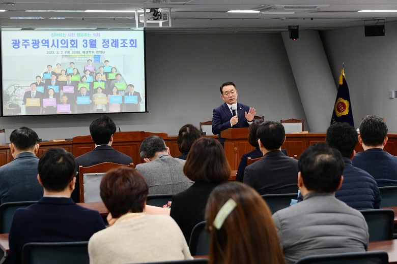 [광주 세계타임즈=손권일 기자] 광주광역시의회(의장 정무창)는 2일 의원과 사무처 직원 등 100여 명이 참석한 가운데 광주시의회 3월 정례조회를 개최했다.