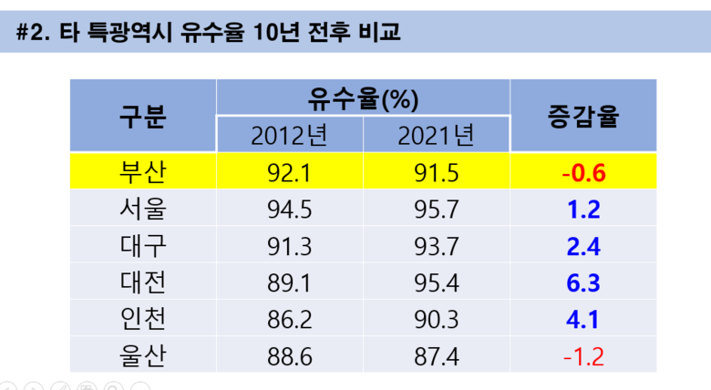 박 의원에 따르면 유수율 1%는 생산원가 36억 원에 달한다. 그럼에도 부산시 유수율은 2021년을 기준으로 91.5%를 기록하는데, 이 값은 10년 전인 2012년의 92.1%보다도 0.6%p 가 오히려 낮아졌다. 공개한 자료에 따르면 타 특·광역 자치단체의 10년 전·후 유수율은 대부분 증가하였으나, 부산과 울산만 소폭 감소했다. 대전과 대구는 부산시보다 2012년을 기준으로 부산시보다 낮은 유수율을 기록하였으나(2012년, 부산(92.1%)/대전(89.1%)/대구(91.3%)), 2021년을 기준으로는 유수율을 크게 개선하여 부산의 91.5% 보다 각 3.9%p, 2.2%p 높은 95.4%, 93.7%를 기록하였다.