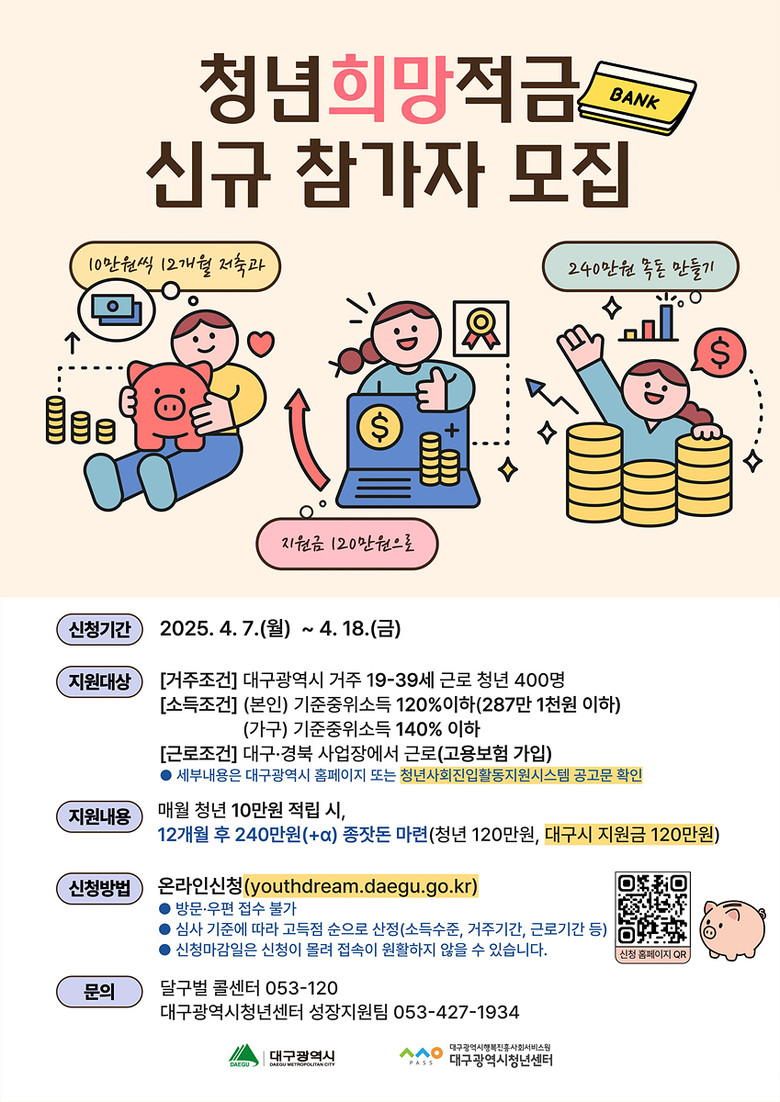 ▸ 4월 7일(월)부터 4월 18일(금)까지 ‘청년희망적금’ 참여자 모집 [세계타임즈=대구 한윤석 기자] 대구광역시는 사회진입 초기의 일하는 청년들에게 소액자산 형성 경험과 기회를 마련해 주기 위해 ‘2025년 청년희망적금’ 사업을 추진하고 참여자를 모집한다.