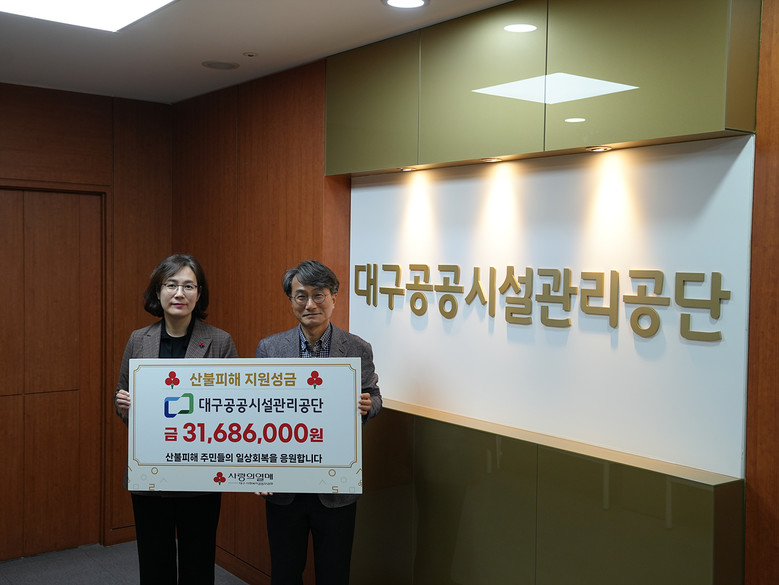 ▸ 안동 등 산불 피해지역 구호 및 복구 지원 등에 쓰일 예정 [세계타임즈=대구 한윤석 기자] 대구문화예술진흥원(원장 박순태, 이하 ‘진흥원’)은 4월 15일(화), 영남권 산불 피해 특별 성금 1천만 원을 대구사회복지공동모금회에 기탁했다.