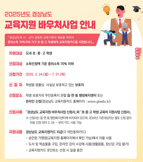 신청기간은 7월 31일까지이며, 경상남도 교육지원카드 누리집(http://gnedu.kr) 또는 보호자의 주민등록상 주소지 관할 읍·면·동 행정복지센터를 방문하여 신청하면 된다.