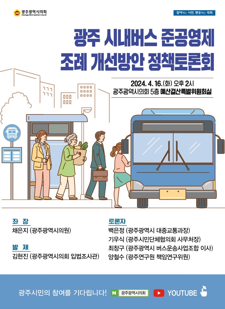 채은지 의원은 “한해에 1천억 원이 넘게 투입되는 시내버스 준공영제의 각종 폐해를 해소하기 위해 조례 개정은 필수적이다”며 “준공영제의 공공성과 투명성을 확보하고, 시민들의 시내버스 이용 편의와 운수종사자의 처우 개선 등을 위한 정책과 대안을 논의하는 자리가 될 것”이라고 말했다.