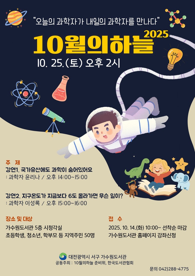 해당 프로그램은 ‘오늘의 과학자가 내일의 과학자를 만나다'라는 주제로 10월의 하늘 준비 위원회와 한국도서관협회가 공동주최하며, 지난 2010년 정재승 박사의 제안으로 시작해 전국 공공도서관에서 동시 진행된다.