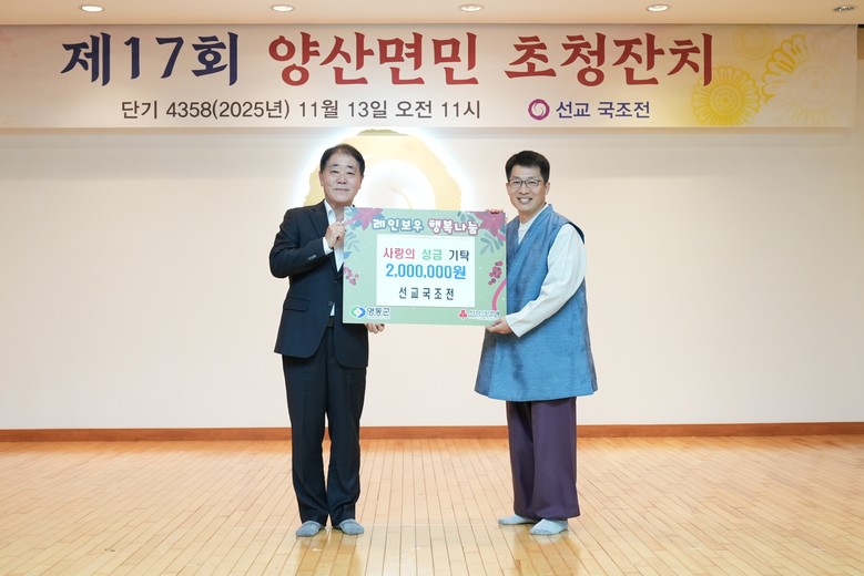 이날 잔치는 식전공연으로 영동노인복지관의 퓨전장구공연을 하며, 선교 기공공연과 양산면 주민의 숟가락난타 공연, 노래자랑, 선물 증정 등으로 참석한 양산면 주민과 어르신 모두 함께 즐겁고 행복한 시간을 가졌다.